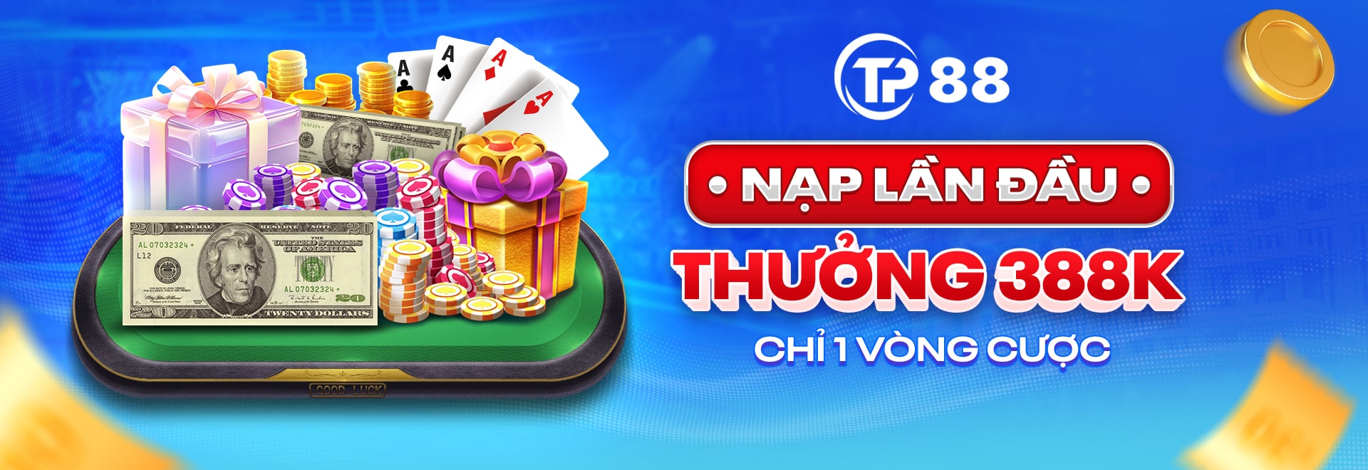 TP88 dành tặng bonus đăng ký mới lên đến 1.000.000 VNĐ cho người dùng khi hoàn tất quá trình tạo tài khoản, xác minh thông tin. Khoản bonus này hỗ trợ bạn có vốn ban đầu để trải nghiệm các tựa game, cá cược mà không cần nạp tiền ngay lập tức.